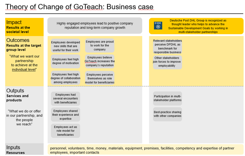 We used the iooi method as a tool to demonstrate the impacts of investments in the GoTeach program. iooi stands for ‘input – output – outcome – impact’. Bertelsmann Stiftung developed the method in cooperation with PricewaterhouseCooper and various other companies, including DPDHL.