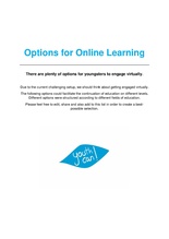 - Options for Online Learning: ... The document describes different online learning options for young people. The document was developed during major global Covid-19 lock downs and therefor focuses on the special needs of young people in this challenging period in early 2020. Access the document in English following this link.